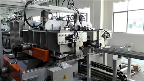 生產(chǎn)線由自動(dòng)上料、沖切機(jī)、包角機(jī)、折邊機(jī)、出料段以及配套的動(dòng)力系統(tǒng)、液壓系統(tǒng)與電控系統(tǒng)等部分組成。